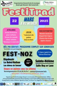 Les élèves des écoles Georges Morin et Saint Joseph de Sainte Hélène ont appris des chants en breton et en français sur le temps scolaire et en partenariat avec l’école de musique Sonam’. A l’occasion du Festitrad, ils nous proposeront une petite restitution publique où vous êtes attendus pour les écouter et les encourager.