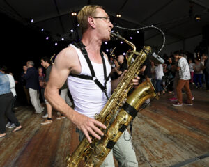 Muni d’un saxophone baryton, Ronan va tous vous faire danser ! Dans la ronde, au plus près des danseurs, c’est avec énergie et talent qu’il vous surprendra.