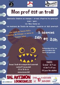 Le 10 juin 2023, l’école de musique vous propose deux représentations d’un projet innovant : les musiciennes et musiciens de l’école de musique ont travaillé plusieurs mois pour mettre en musique la pièce de théâtre « Mon prof est un troll » de Dennis Kelly, interprété par Raphaëlle Salama et Gaëlle Bervas de la Cie Tête Haute